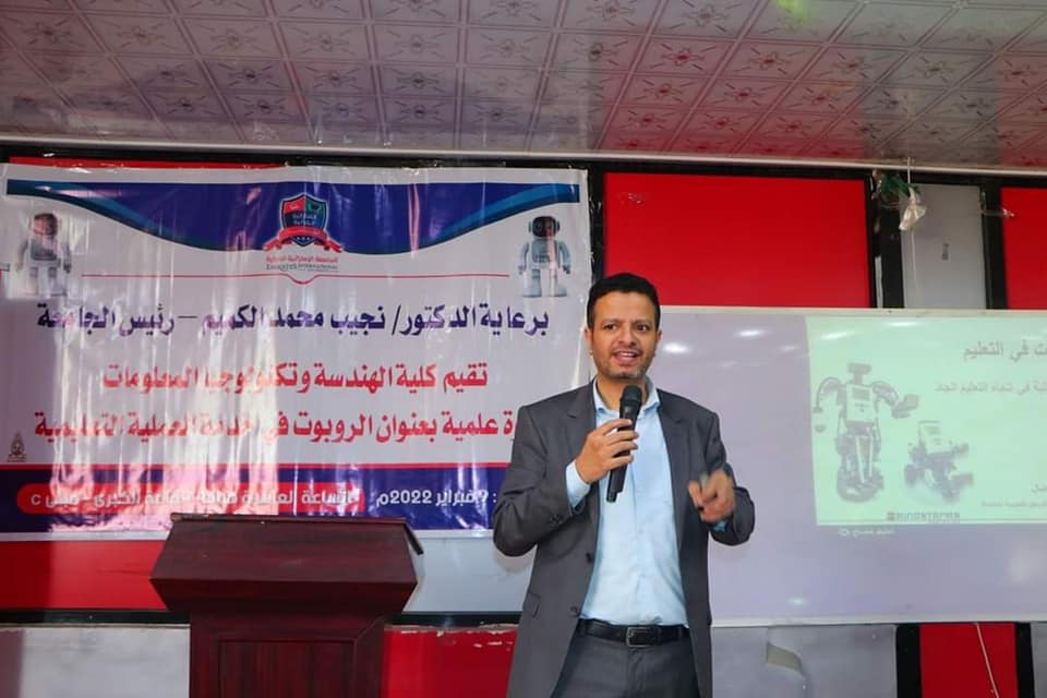 ندوة علمية حول الروبوت في خدمة العملية التعليمية تنظمها كلية الهندسة وتقنية المعلومات، برعاية الأستاذ الدكتور / عارف محمد الحكيمي رئيس الجامعة بالوكالة نظمت عمادة كلية الهندسة وتقنية المعلومات ندوة علمية حول الروبوت في خدمة العملية التعليمية قراءة المزيد